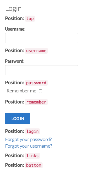 top- at the beginning of the login form;username- after the username field;password- after the password field;remember- after remember checkbox;login- after login button;links- after the footer links (triggers only in case the links should be displayed);bottom- at the end of the login form.